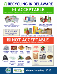 Many items can be recycled but only certain items are acceptable in Delaware’s single-stream curbside recycling program. “Single-stream” recycling is where all traditional recyclables such as paper, plastic containers, cans, glass bottles and jars, cardboard, and cartons are placed in the same container (cart or dumpster), separate from your trash. Delaware only accepts certain items because of their ability to be sorted and then sold to a market for further use.